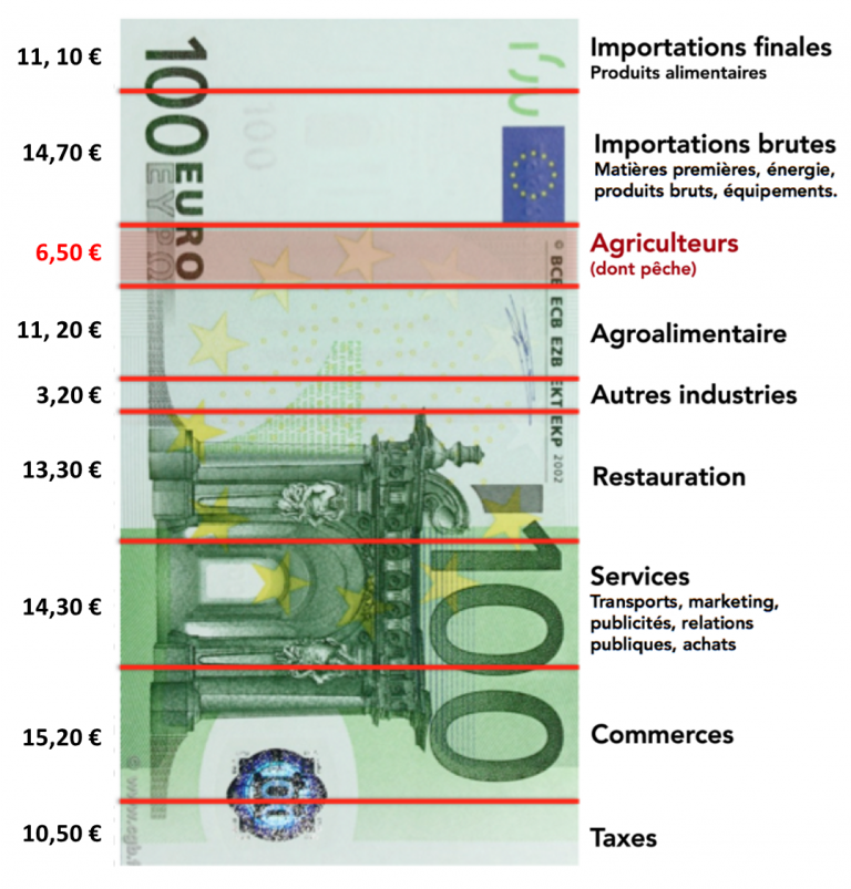 Dans le système alimentaire classique, les agriculteurs ne touchent qu’une très faible part de l’argent dépensé pour se nourrir. Selon les estimations de l’«euro alimentaire» de l’Observatoire de la Formation des Prix et des Marges, sur 100€ dépensés en produits alimentaires, seulement environ 6.90 € reviennent aux producteurs, soit à peine 6,9 % de la valeur finale.